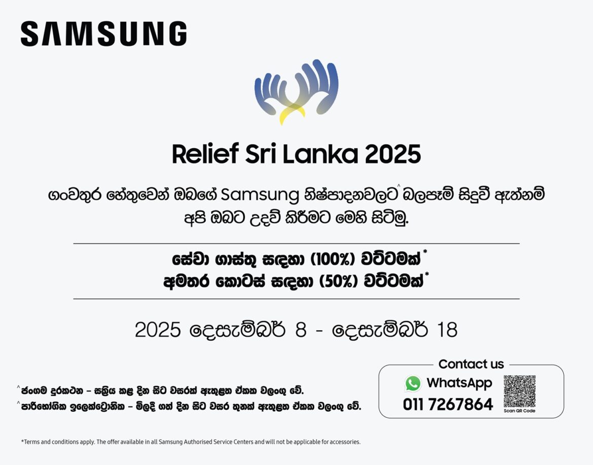 පසුගියදා ඇති වූ දිට්වා සුළි කුණාටුව හේතුවෙන් පීඩාවට ලක් වූ ජනතාවට සහාය වීම අරමුණු කරගනිමින් ‘’Relief Sri Lanka 2025’’ ජාතික වැඩසටහන ආරම්භ කරන බව Samsung Sri Lanka සමාගම පසුගියදා නිවේදනය කළේය. පසුගිය නොවැම්බර් 27 වන දින සමස්ත දිවයිනටම බලපෑ දිට්වා සුළි කුණාටුව හේතුවෙන් දිස්ත්රික්ක 25ක මිලියන 2කට අධික පිරිසකට බලපෑම් එල්ල විය. සිය ගණනකගේ ජීවිත අහිමි කළ එය තවත් බොහෝ පිරිසකට උන් හිටි තැන් පවා අහිමි කරනු ලැබුවේ ඔවුන්ව දැඩි අසීරුතාවයකට පත් කරමිනි. ඒ නිසාම ආරක්ෂාව වෙනුවෙන් විවිධ ආරක්ෂිත ස්ථානයන් වෙත යොමු වීමට සිදු වූ ඔවුන් අද වන විට දිවයින පුරා පිහිටි ආරක්ෂිත ස්ථාන 956ක රැකවරණය ලබයි. ඔවුන් මුහුණ දුන් ගංවතුර තත්වයන් හමුවේ නිවසේ තිබූ විදුලි උපකරණ සහ ජංගම දුරකතනවලට ද සිදු වූයේ සුළු පටු හානියක් නොවේ. එම නිෂ්පාදන අලුත්වැඩියා කර ගැනීම සඳහා Samsung Sri Lanka ආයතනය වෙත ඉල්ලීම් රැසක් ගලා එන්නට විය. සුළි කුණාටුව හේතුවෙන් සියලු දේ විනාශ වූ ඔවුන්ට තමන්ගේ විදුලි උපකරණ හා ජංගම දුරකතන අලුත්වැඩියාව සඳහා අමතර මුදලක් වියදම් කිරීම ඉතා දුෂ්කර කරුණක් විය.