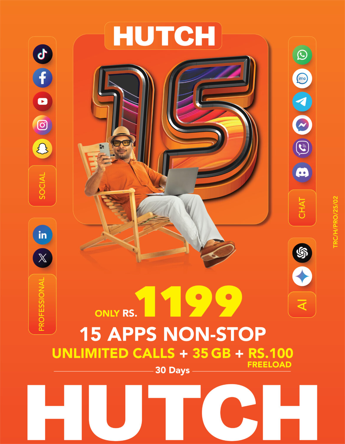 ශ්රී ලංකාවේ ඩිජිටල් ක්ෂේත්රය නව මානයකට ගෙන යමින්, දෛනිකව අත්යවශ්ය වන ජනප්රිය ජංගම යෙදුම් (Apps) 15ක් සඳහා එකම ගාස්තුවක් යටතේ අසීමිතව පිවිසීමේ පහසුකම සලසන “HUTCH 15” ස්මාර්ට්ෆෝන් සැලසුම දියත් කිරීමට HUTCH සමාගම පියවර ගෙන ඇත. ශ්රී ලාංකිකයින්ගේ කුසලතා වර්ධනය කිරීමට, කාර්යක්ෂමතාව ඉහළ නැංවීමට සහ ජාතික ඵලදායිතාවයට දායක විය හැකි අයුරින් ඉතා සැලකිලිමත්ව මෙම ජංගම යෙදුම් තෝරාගෙන තිබීම මෙහි විශේෂත්වයකි.