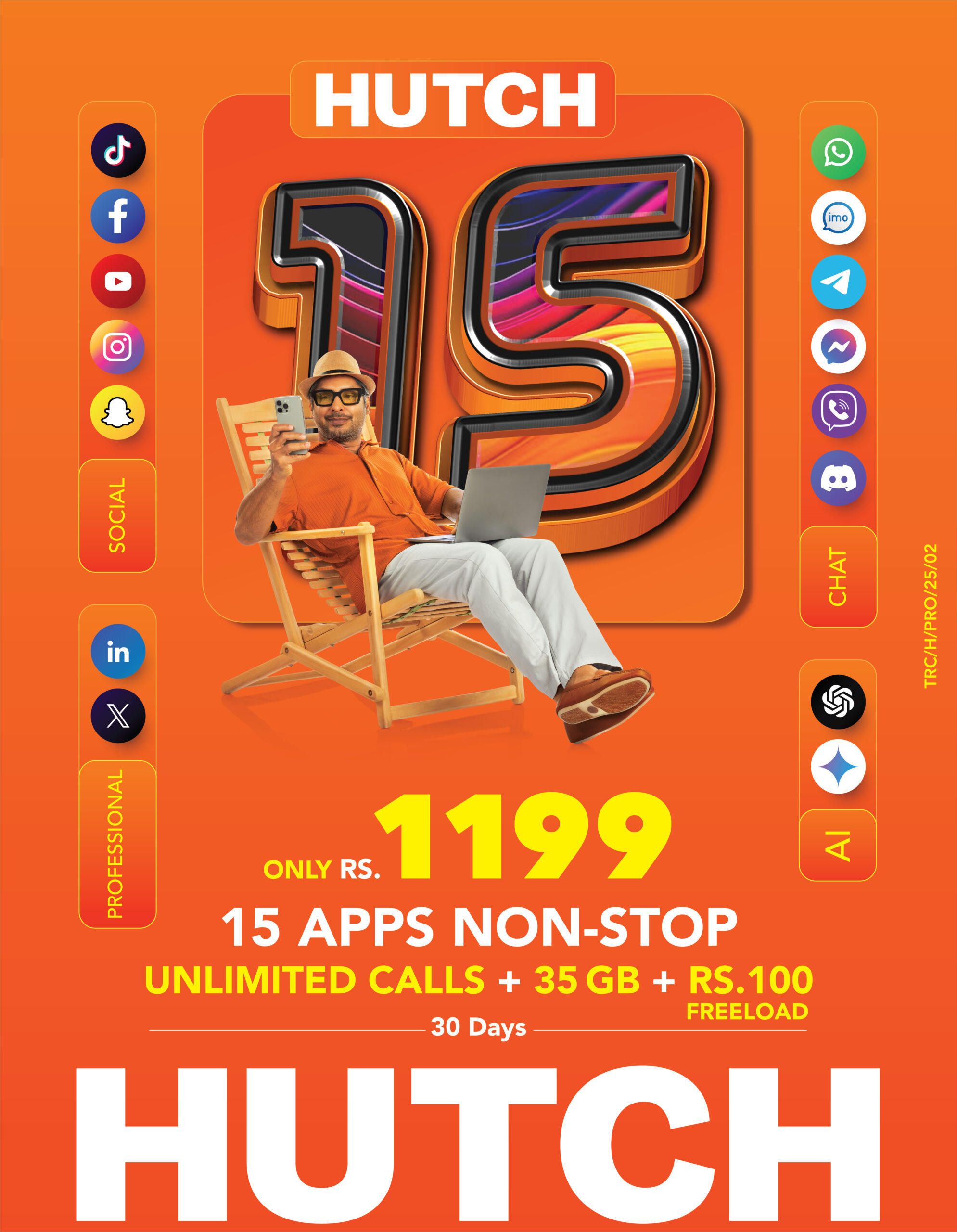 මුළු ගාස්තුව රුපියල් 1,199ක් වැනි සහනදායී මිලකට ලබා දෙන මෙම සැලසුම, දිවයින පුරා විහිදුණු ශක්තිමත් HUTCH ජාලය හරහා ඕනෑම ස්මාර්ට්ෆෝන් පරිශීලකයෙකුට ඉතා පහසුවෙන් ලබාගත හැකිය.